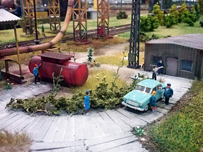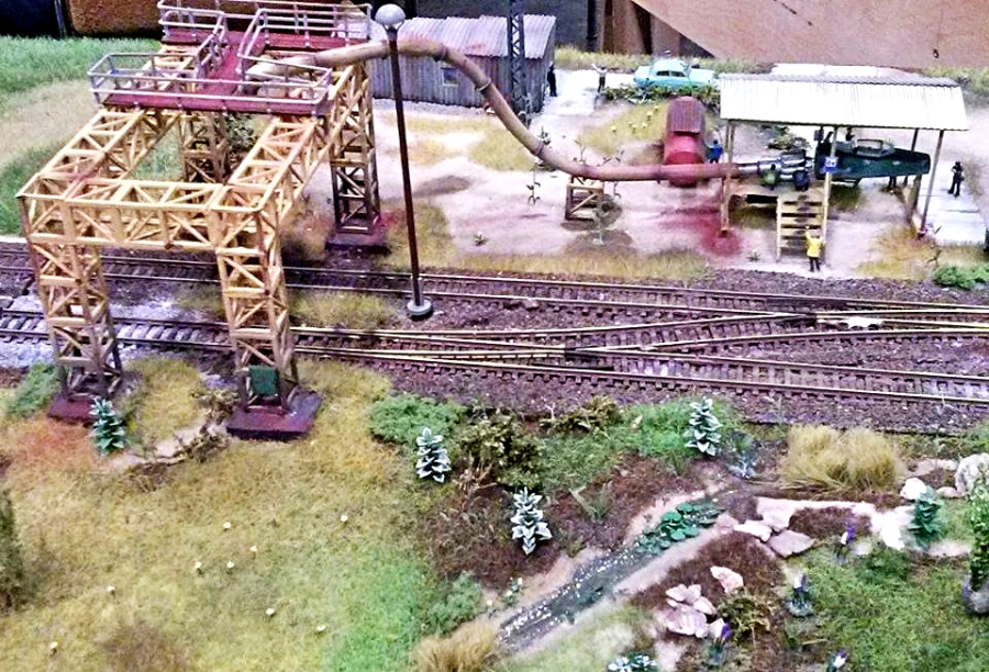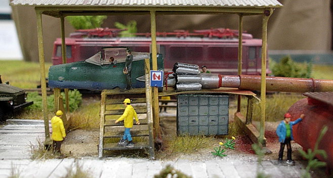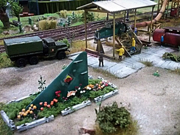 Modell: Das Modul „Auftaueinrichtung in einem Tagebau“ stellt eine solche Anlage dar. Das Modul hat eine Größe von 50 cm x 50 cm und wurde an Hand eines originalen Fotos einer solchen Anlage weitestgehend nachgebaut. Gleismaterial und Weichenantriebe sind von Tillig. Die Raumerweiterungshalle ist ein Eigenbau aus Resin.