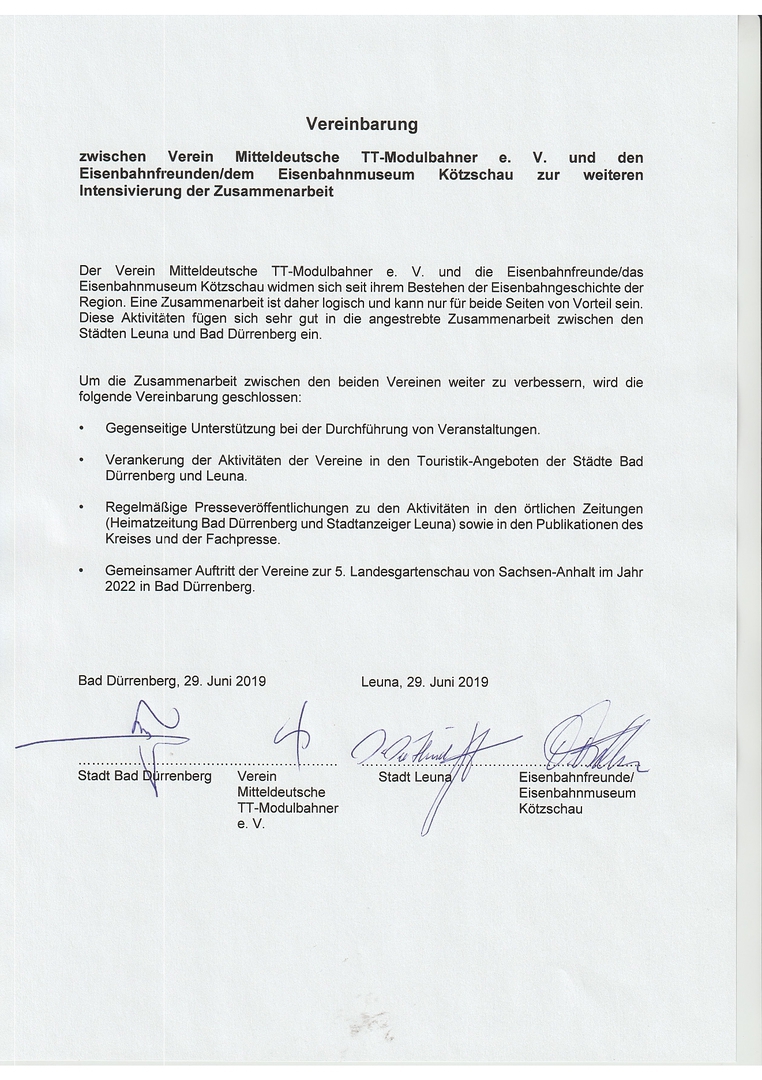 Die Zusammenarbeit der Mitteldeutschen TT-Modulbahner und der Eisenbahnfreunde/des Eisenbahnmuseums Kötzschau wurde bereits durch den gemeinsamen Auftritt während des diesjährigen Brunnenfestes in Bad Dürrenberg dokumentiert. Die nächsten gemeinsamen Projekte sind die Gestaltung der neuen Sonderausstellung „Die Werkbahn des Chemiestandortes Leuna“ im Eisenbahnmuseum Kötzschau sowie die Beteilung an der „modell-hobby-spiel“ Anfang Oktober auf der neuen Leipziger Messe.