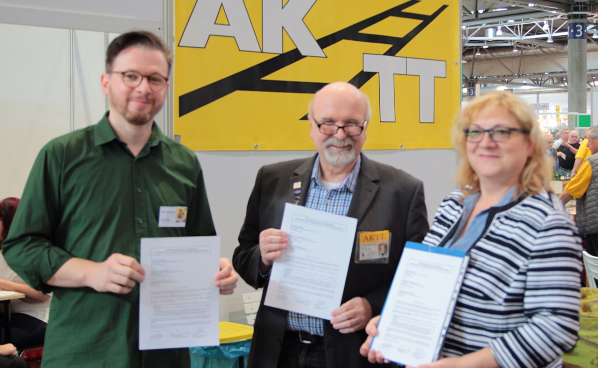 Zur Unterzeichnung waren der Vereinsvorsitzende der Eisenbahnfreunde Kötzschau e.V., Herr David Falk, sow ie der Vereinsvorsitzende der Mitteldeutschen TT Modulbahner e.V., Herr Klaus Bossig zugegen
