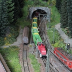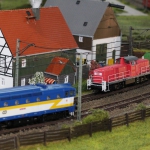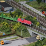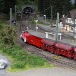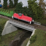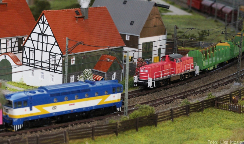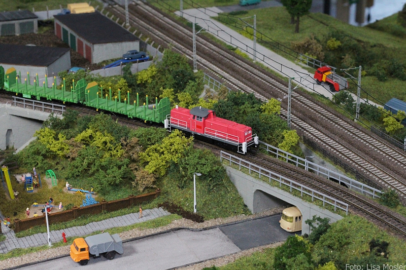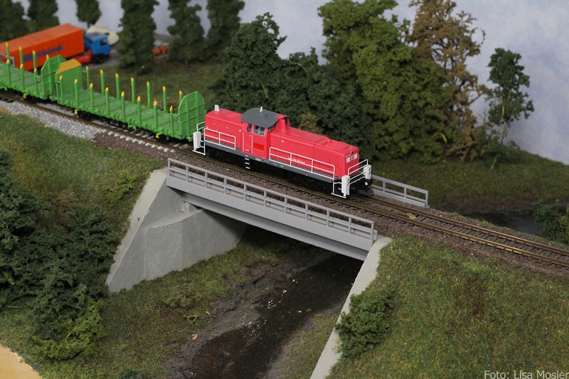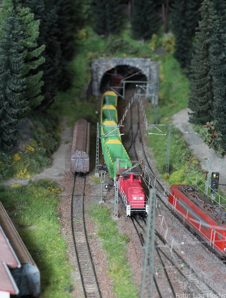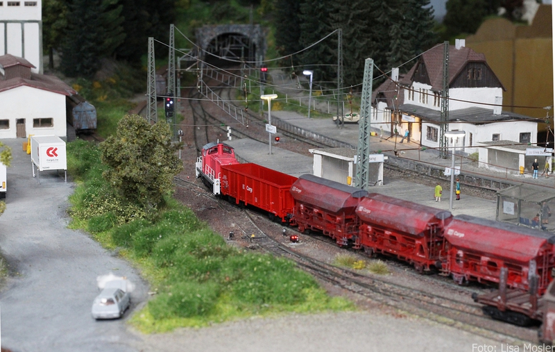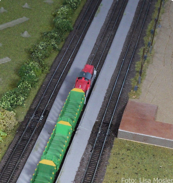 Nachdem unser 120 mal verkleinerter Rangierer einen Zug aus leeren Wagen zusammengestellt hat, geht die Reise über unser Modularrangement los.
