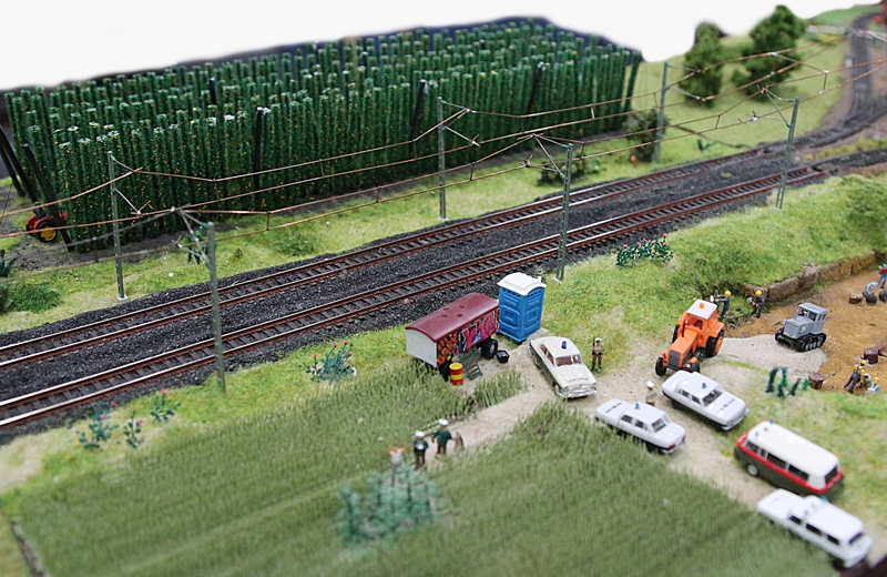 Weiter geht es mit unserem Zug in Richtung Blockstelle Fährendorf, an einer Schafherde und dem Modul Hopfenfeld vorbei, bis der Abzweig von Ronald Jung erreicht