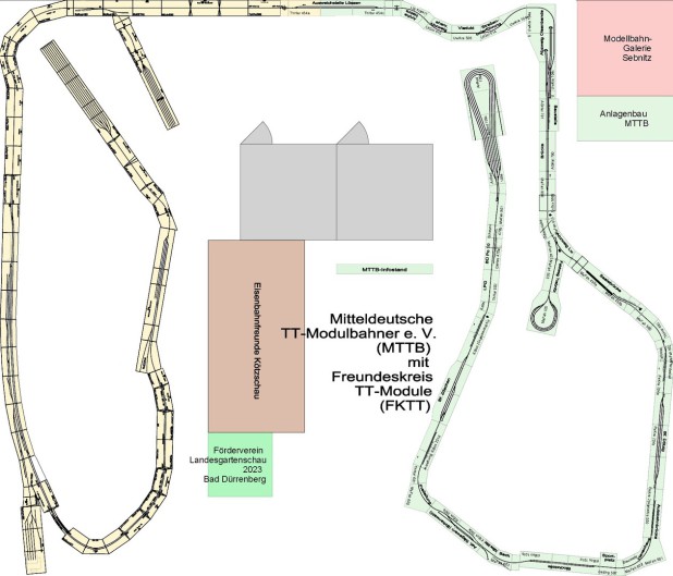 Über die Ausweichstelle Lössen werden vom MTTB zum FKTT und umgekehrt übergeben und fahren dann im jeweils anderen Teil des Modularrangements. Dabei passieren sie die jeweils ersten Betriebsstellen, die Haltestelle Schkona beim FKTT mit Haltepunkt und Abzweigstelle und den Abzweig Olsenbande beim MTTB. Damit wird auf einer Fläche von rund 400 m2 ein interessanter Betriebsablauf gestaltet, wie er abwechslungsreicher nicht sein kann. Daneben wird es auf den verschiedensten Modulen zahlreiche Details für die Besucher zu entdecken geben. Ein besonderer Hingucker ist der Neubau des Empfangsgebäudes vom Bahnhof Dölzig, dass eine entsprechende Inneneinrichtung besitzt.