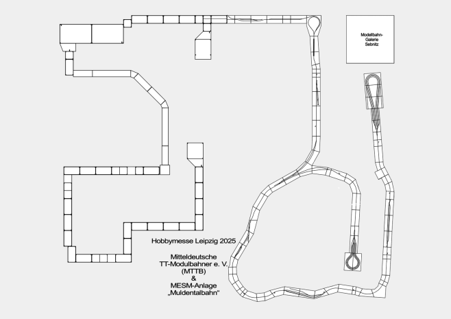 EDie Mitteldeutschen TT-Modulbahner e. V. (MTTB) präsentieren zur Hobbymesse 2025 gemeinsam mit den Freunden des Verbandes der Modelleisenbahner, Eisenbahn- und Straßenbahnfreunde Mitteldeutschland e. V. (MESM) eine Rundreise durch die drei mitteldeutschen Bundesländer im Maßstab 1:120. Das Modularrangement ist wieder so aufgebaut, dass Züge auf dem gesamten Modularrangement verkehren können, unabhängig der Vereinszugehörigkeit.