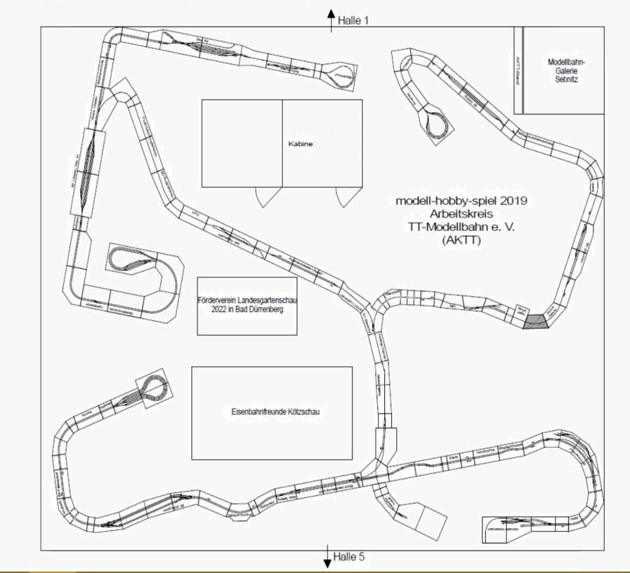 Der Verein Mitteldeutsche TT-Modulbahner (MTTB) war in diesem Jahr wieder auf der „modell-hobby-spiel“ in Leipzig vertreten und gestaltete mit viel Engagement den 400 m2 großen Messestand des Arbeitskreises TT-Modellbahn e. V. (AKTT). Wenn dabei auch etwas Wehmut dabei war: Der AKTT löst sich gemäß einem Beschluss des Jahreshauptversammlung vom 08. September 2019 zum Jahresende auf. Das Gründungsziel, die Nenngröße TT am Leben zu erhalten, ist erfüllt. Die Regionalgruppe Bad Dürrenberg des AKTT tritt bekanntlich unter der eingangs genannten Bezeichnung auf. Das Standpersonal des MTTB trat dabei zum ersten Mal mehrheitlich in grünen T-Shirts auf. Die Schriftelemente und einige Modellbahner zeigten noch einmal die gelbe Farbe bzw. die gelben T-Shirts des AKTT.